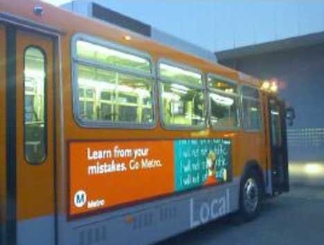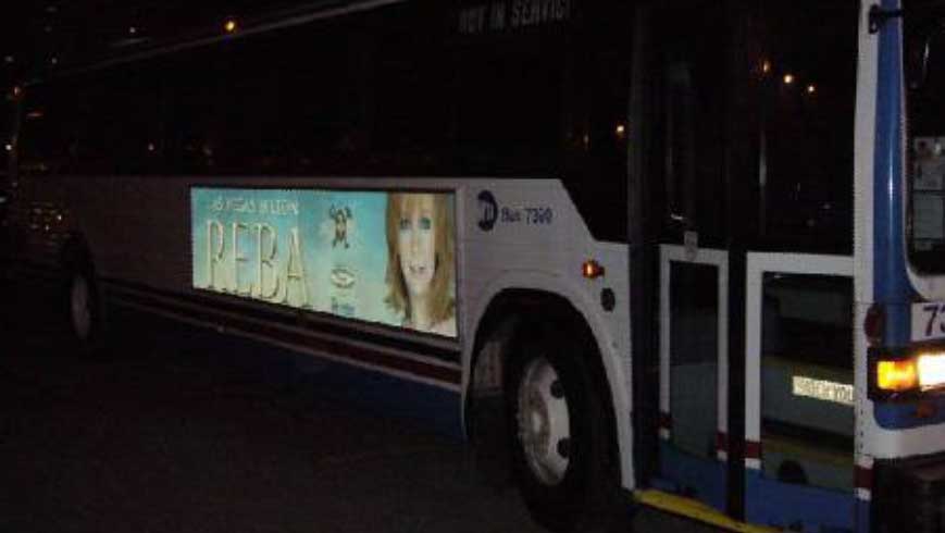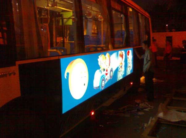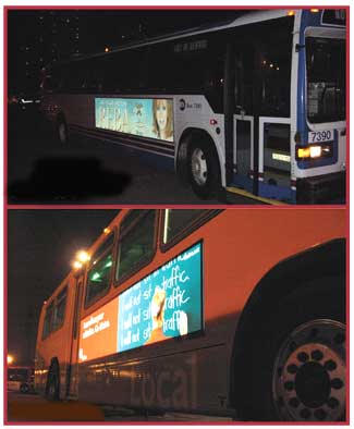 さまざまなバスの広告看板です。 夜間ひときわ目立ち印象的です。