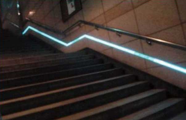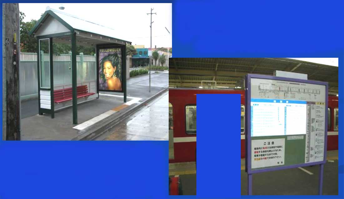 左:バスの停留所の夜間に目立つ看板 右:日本の鉄道の時刻表バックライト