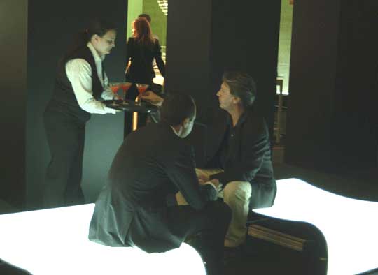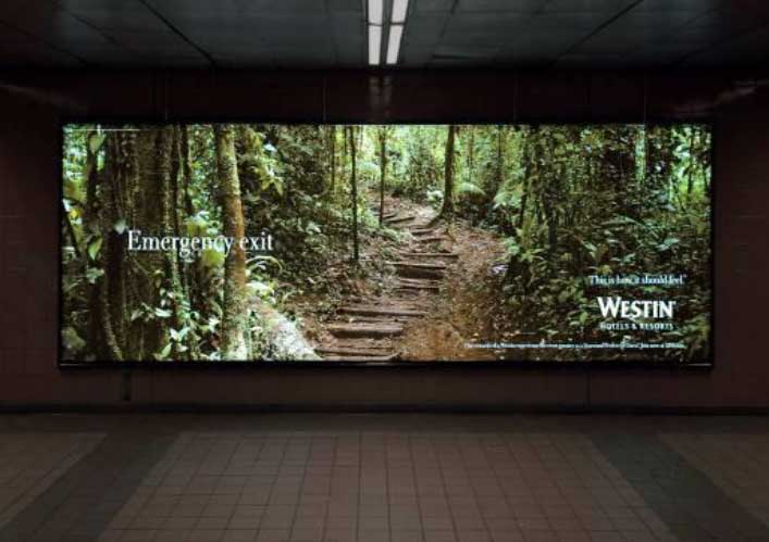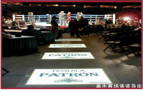 床面での広告は特に目立ちます。床マットと併用すれば印象的です。右:夜間