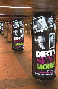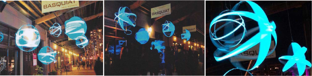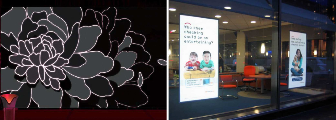 左:花の形など自由に加工でき、点滅プログラムもできます。 右:シティ銀行のウィンドウに貼り付けた広告。
