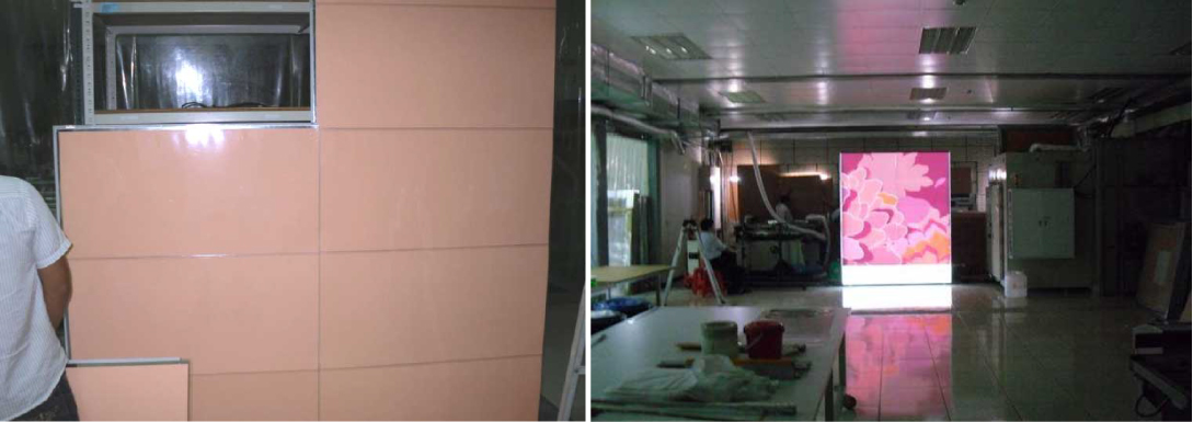 看板制作風景 左:このサイズのLECを繋いで組立も可能。 右:継ぎ目は全く見えません。